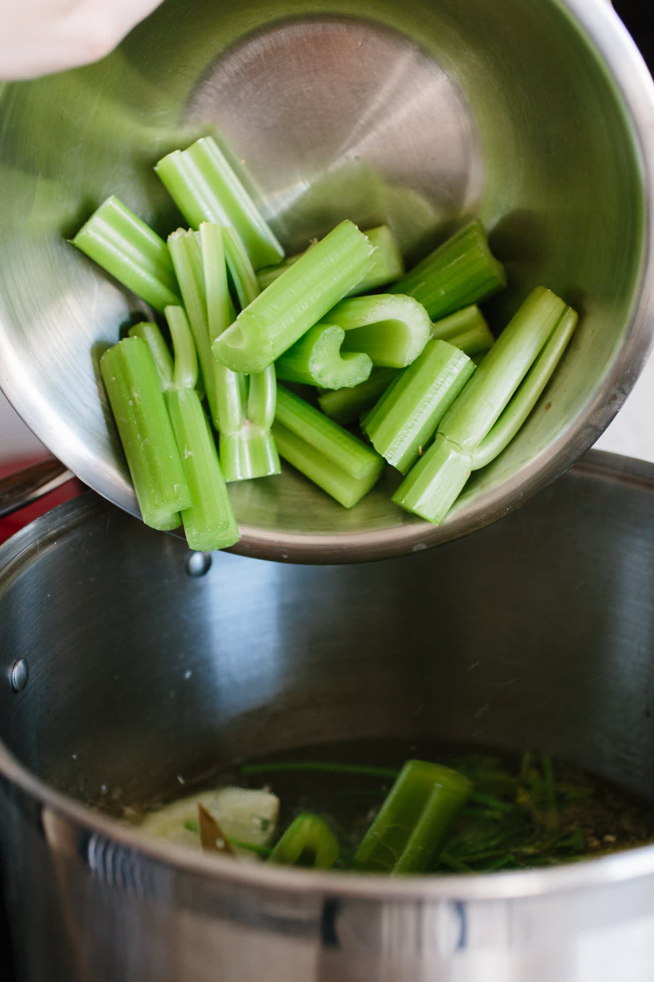 Simmer until everything is heated and cooked through. The most important thing to remember when making a homemade chicken soup from scratch is to put those chicken leg bones back into your stock pot as you cook the soup with the rest of the veggies and meat. Rinse out the stockpot, return the broth to the pot and place it on the hot burner. Before serving remove the bones. As you cook the chicken soup, you may need to keep adding water to the pot as it evaporates with the steam.